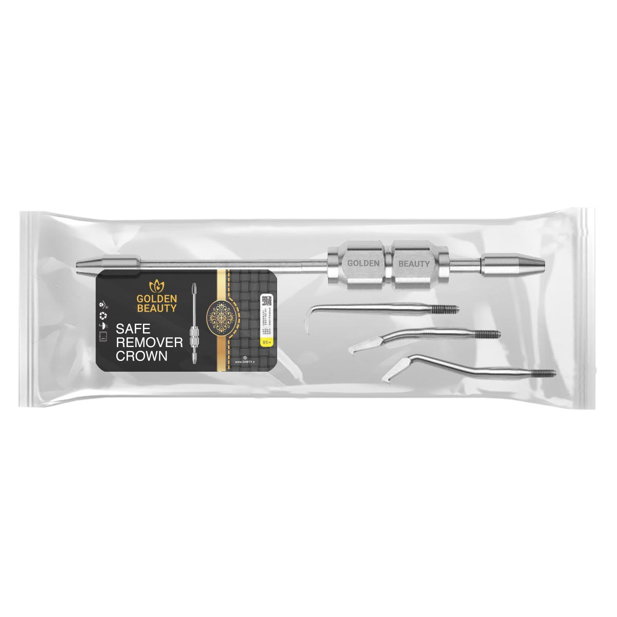 آرچ کرون دندانپزشکی گلدن بیوتی برای جدا کردن بریج ، کرون و قطعات پروتزی می باشد نام دیگر آن Bridge remover یا crown remover می باشد . در دندانپزشکی آرش کرون نیز به آن اطلاق می شود . این پک علاوه بر تنه داری 3 سری با کاربرد های متفاوت می باشد. تمام قطعات آرشکرون قابل استریل در اتوکلاو می باشند . طراحی ارگونومیک آرچکرون برای قرار گیری در دست پزشک باعث سهولت در استفاده از آن شده است .