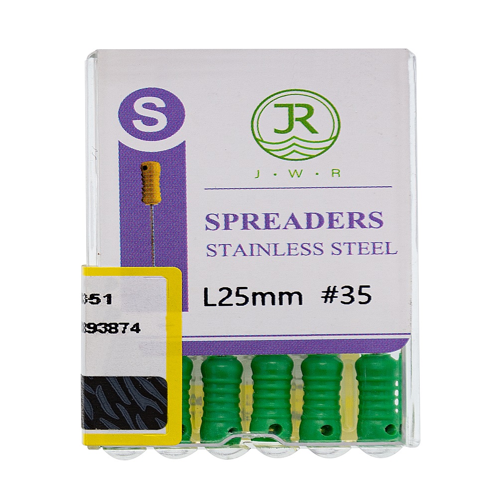 spreader(اسپریدر) JWR سایز 35 طول 25mm: اسپریدرها فایل های دستی صاف و نوکداری می باشند که همانند دیگر فایل ها دارای سایزبندی و جنس(استیل – نیکل تیتانیوم) مختلف هستند. فشرده سازی با این وسیله باعث می شود که مواد به داخل و انتها دندان فرو رفته تا بدنه ای صاف بر روی دندان بماند و دندان حالت طبیعی به خود بگیرد . این نوع فایل دارای بدنه صاف و نوک دار است. این بدنه صاف کمک می کند که پرکردن، فشرده سازی و تراکم جانبی گوتا پرکا راحت تر انجام شود. دارای استاندارد FDA آمریکا و CE اروپا و جنس STAINLESS STILL است