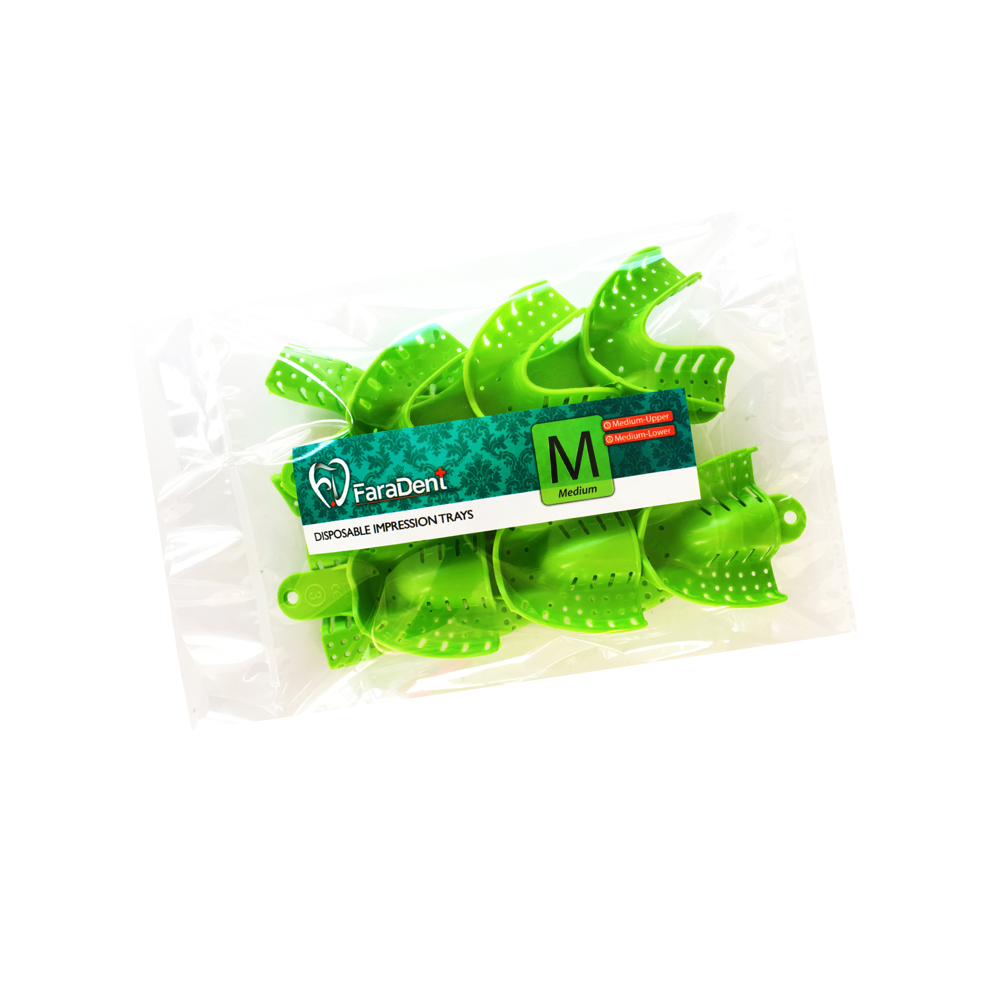 تری قالب گیری بادندانی مدل M فارادنت شامل ۱۲ عدد تری که از ۶ عدد تری سایز مدیوم فک بالا و ۶ عدد تری سایز مدیوم فک پایین می باشد . این تری ها با عنوان یکبار مصرف مشهور هستند ولی می توانین بعد از استفاده با آب ولرم و فرچه کاملا آن را تمیز کرده و مجددا مورد استفاده قرار دهید . این محصول تحت لیسانی و تکنولوژی ایتالیا می باشد . از مزایا و کاربرد های آن می توان به طراحی آناتومیک ، مناسب برای قالبگیری عمومی و ایمپلنت ، شستشوی راحت ، مواد پلیمر درجه یک ، دارای سوراخ و شیار های استاندارد و دارای لبه با ارتفاع استاندارد و غیره اشاره کرد .