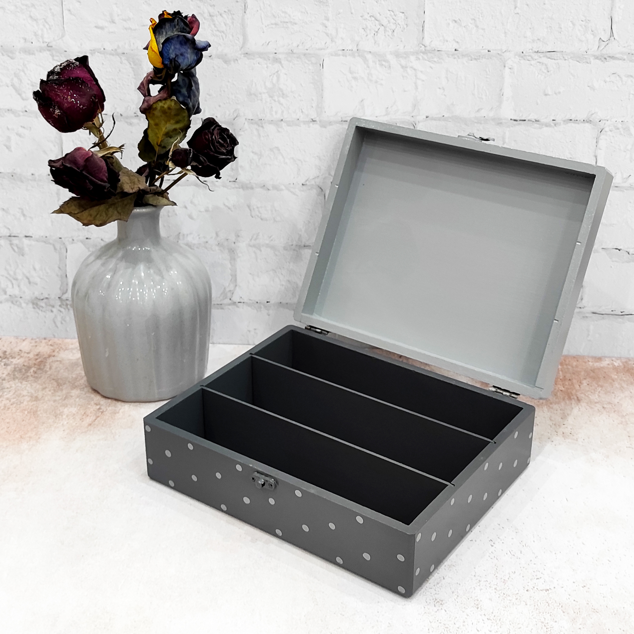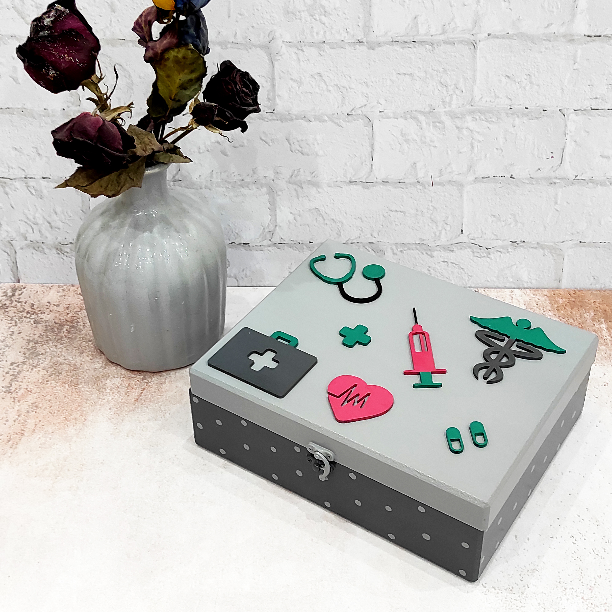 این محصول زیبا و چشم نواز شامل یک جعبه چوبی دارو ،در سایز 20×25 با ارتفاع 8 است و دارای سه تقسیم داخل خود است که به مرتب شدن لوازم داخل آن کمک میکند و تقسیم ها قابل برداشته شدن است.این محصول مناسب برای نگه داری از داروها و شربت های داخل منزل و یا اداره است داخل آن لوازم کمک های اولیه موجود نیست.رنگ جعبه طوسی روشن و تیره و طرح برجسته روی آن که المان های مخصوص هستند، در چند رنگ چشم نواز کار شده است .تمامی سطح محصول بعد از رنگ شدن با مواد باکیفیت و مرغوب ضد آب شده است که باعث میشود چوب باد نکند و وقتی درمعرض رطوبت قرار میگیرد پوسته پوسته نشود.این محصول زیبا برای خرید جهیزیه فوق العاده است امیدوارم با خرید این محصول علاوه بر رفع نیاز ،از زیبایی ،دست ساز بودن و هنر ایرانی نیز لذت ببرید.