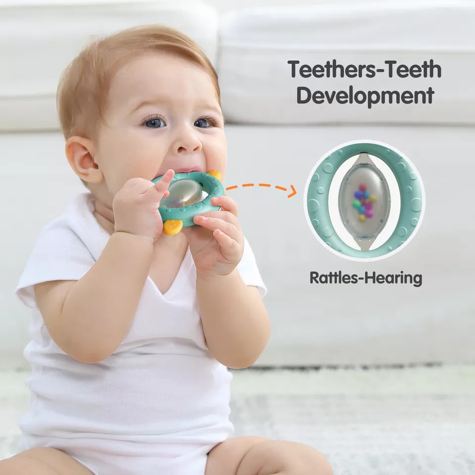 مجموعه 6 عددی در طرح ها و رنگ های مختلف قابل استفاده بعنوان جغجغه و دندان گیر برای کودکان از بدو تولد