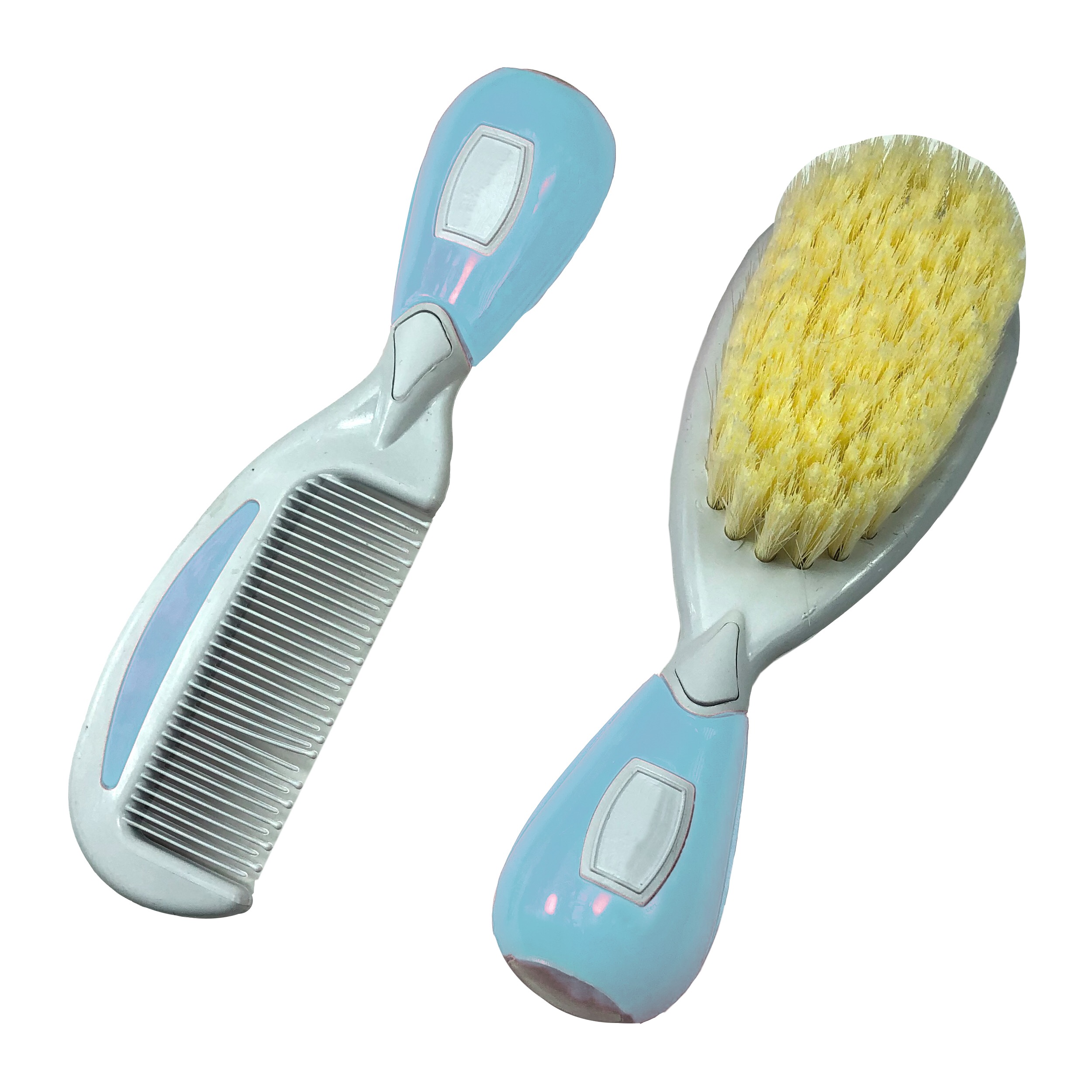 ست شانه و برس در دو رنگ آبی آسمانی و صورتی درخشان، مخصوص استفاده نوزادان دلبندتان میباشد. انتهای دسته دانه های رنگی تعبیه شده است که بعنوان جغجغه مورد استفاده قرار میگیرد.