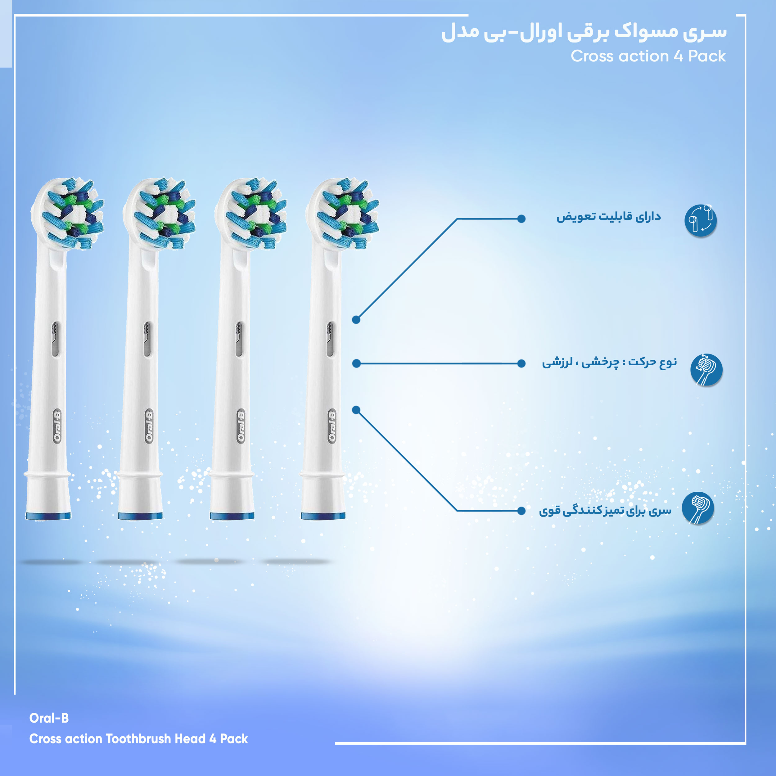 سری یدک مسواک برقی اورال بی مدل CROSS ACTION حاوی 4 عدد سری مسواک است و برای کسانیکه به سلامت دهان و دندان خود اهمیت می دهند، انتخابی ایده آل به نظر می رسد. دندانه های این سری قدرت تمیز کنندگی بالایی دارد و پلاک های دندان را ازبین می برد. علاوه بر این، برس گرد این سری طوری طراحی شده که به دندان های عقب به راحتی دسترسی پیدا می کند و همه ی دندان ها و فواصل بین آن ها را به طور کامل تمیز می کند و از ایجاد لکه روی دندان ها جلوگیری می کند. دندانه های سری یدک مسواک برقی اورال بی بسیار لطیف و در عین حال کارامد است. به طوری که باعث حساسیت و اذیت شدن دندان و لثه نمی شود اما به خوبی می تواند دندان ها را از هرگونه میکروب و مواد غذایی تمیز کند. این محصول از اورال بی سرییدک مسواک های برقی است و با هر یک از مسواک برقی های اورال بی قابل استفاده است. همچنین مجهز به تکنولوژی نوسان وچرخشی برای حداکثر تمیز کردن و سفید کردن دندان ها است. به طور کلی و بر اساس توصیه دندان پزشکان بعد از تغییر رنگ الیاف برس مسواک، زمان تعویض سری فرا رسیده است. سری های اورال بی قیمت بسیار مناسبی دارند و خرید این پکیج از نظر اقتصادی مناسب و مقرون به صرفه می باشد. مطالعات مختلف نشان می دهند که استفاده از مسواک های برقی در بیشتر مردم سودمند است چرا که بدون توجه به توانایی فردی، یک تکنیک خوب مسواک زدن را فراهم و انگیزه فرد را تقویت می کنند و مقبولیت بیشتری در طولانی مدت دارند. از این رو استفاده از مسواک برقی به همه افراد توصیه می گردد. مسواک برقی اورال بی در سطح جهان بیش از برندهای دیگر از سوی دندان پزشکان توصیه و مورد استفاده قرار می گیرد.