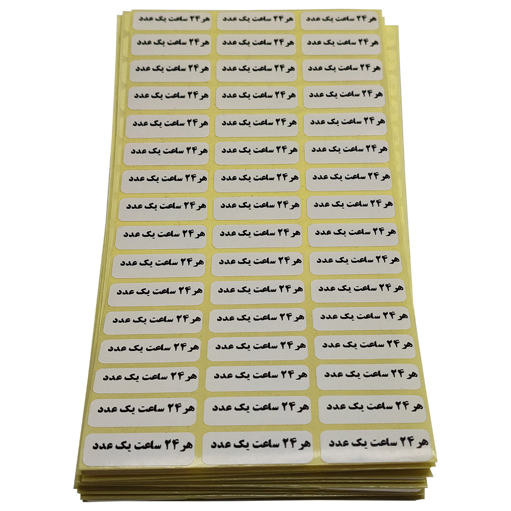 لیبل زمانبندی دارو مدل 24 ساعت از 1000 عدد لیبل در ابعاد 1 سانتیمتر در 3 سانتیمتر تشکیل شده است. این محصول در داروخانه ها و بیمارستانها و مراکز پزشکی، جهت تعیین زمان بندی صحیح دارو کاربرد دارد.محصول (24 ساعت )شامل 1000 عدد لیبل با عنوان (هر 24 ساعت یک عدد) می باشد.