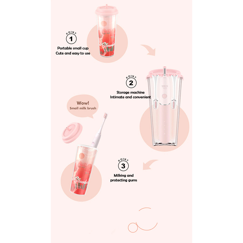 اگر با محصولات سوکاس آشنایی ندارید باید بگوییم این برند از زیرمجموعههای لوکس شیائومی است که به طراحی و تولید محصولات برقی شخصی میپردازد. جدیدترین و پیشرفته ترین مسواک برقی این برند Soocas V2 است که برنده چندین جایزه به علت طراحی خلاقانه خود شده است. این محصول برای هدیه دادن انتخاب خیلی خوبی است وهمه از همان ابتدا با دیدن جعبه محصول به وجد خواهند آمد. از طراحی جعبه که بگذریم باید به نگهدارنده مسواک اشاره کنیم که شکل یک لیوان طراحی شده و مسواک و دو سری مخصوص آنرا در خود جای میدهد. این محصول در دو رنگ زیبای صورتی و سبز به بازار ارائه شده است.