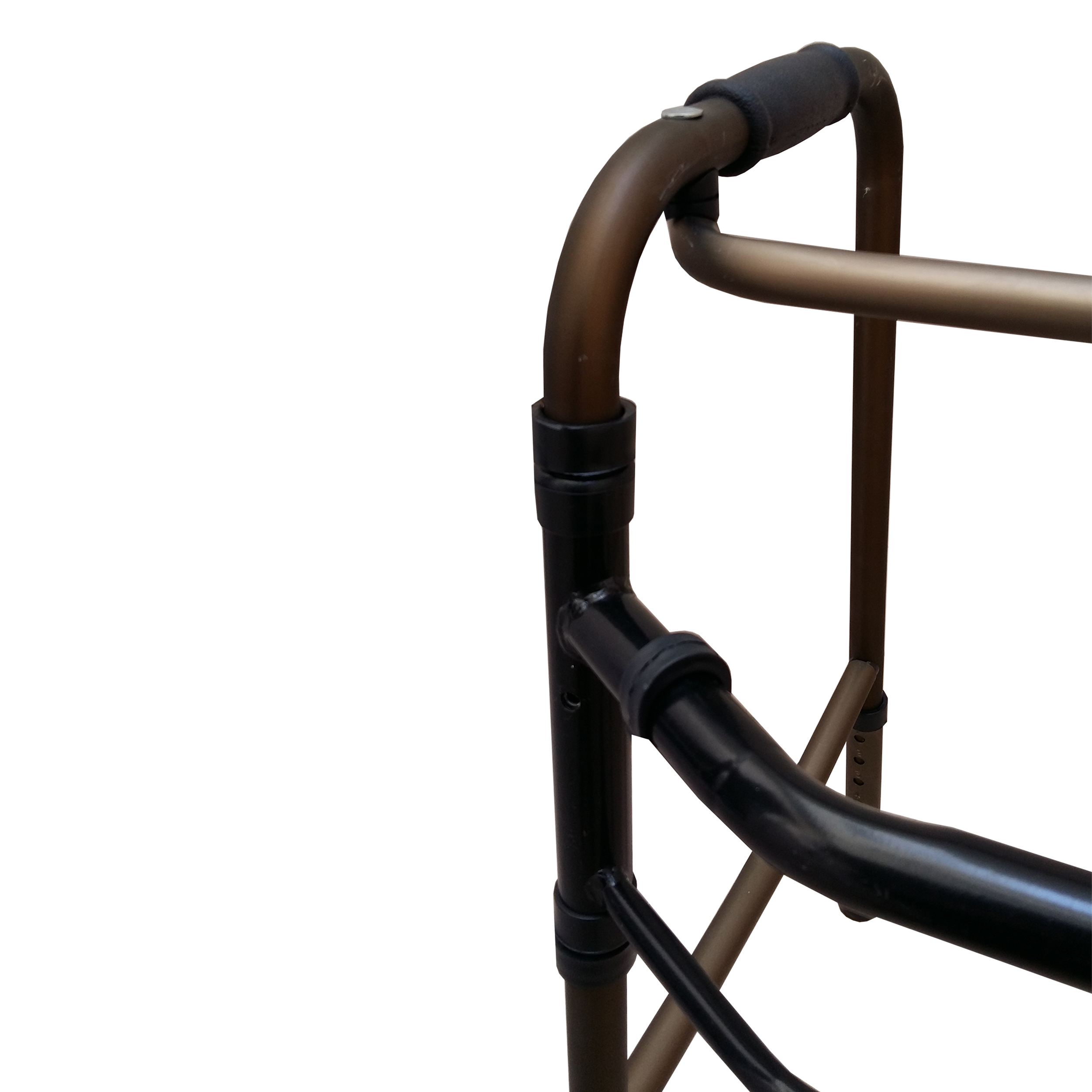 واکر یکی از ابزار های کمکی توانبخشی سالمندان می باشد که افراد سالمند در صورت ناتوانی در حفظ تعادل در هنگام راه رفتن ، نشستن و بلند شدن باید از آن کمک گرفته و از وارد شدن آسیب های احتمالی پیشگیری به عمل آورند. استفاده از واکر توسط سالمندان از وارد آمدن فشار های سنگین و نگهانی به مهره های کمر و مفصل زانو جلوگیری می کند. واکر در انواع مختلف اعم از واکر ثابت و تاشو ، واکر چرخدار و بدون چرخ یافت می شود . ارتفاع این واکر قابل تنظیم بوده و شما متناسب با طول قد شخص استفاده کننده می توانید میزان ارتفاع آن را تغییر دهید در حالی که بعضی دیگر از واکرها در یک ارتفاع استاندارد به صورت ثابت می باشند . این واکر از نوع تاشو بوده و به راحتی فشار دادن یک پین که در وسط واکر تعبیه شده است می توانید واکر را جمع کرده و جهت حمل و نقل آسانتر از آن بهره جوئید . از طرف دیگر ارتفاع این واکر چرخدار قابلیت تنظیم در چندین مرحله مختلف را نیز دارا می باشد که شما می تواند بنا به اندازه قد سالمند آن را تنظیم کنید . واکر اگر متناسب با قد شخص استفاده کننده تنظیم شود از وارد آمدن فشار به قسمت مچ دست جلوگیری می کند و تعادل شخص سالمند را بهتر حفظ می کند. اکثریت واکر ها دارای رنگ نقره ای یا طوسی می باشند اما این واکر با رنگ برنزی و مشکی بسیار شیک و جلوه ی ویژه ای دارد.
